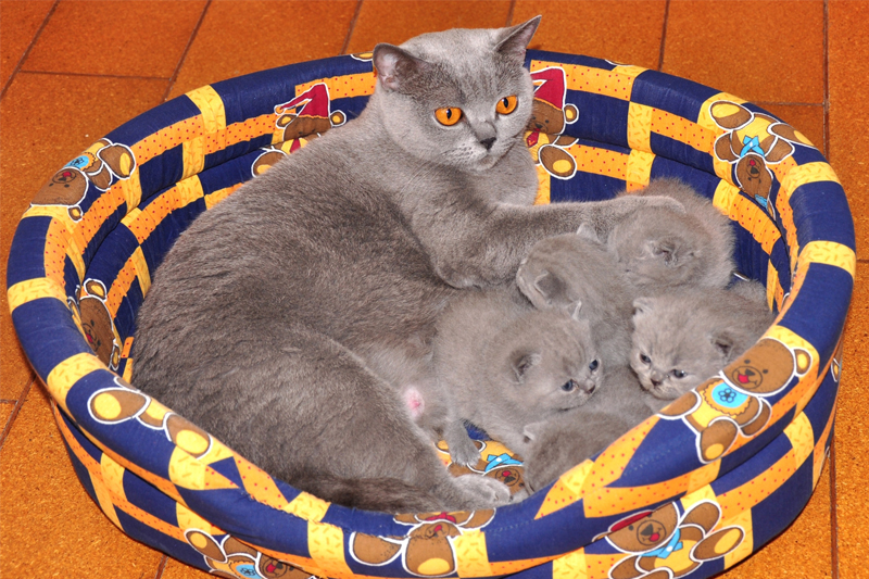 Sarah porodila šest modrých koťátek. 4 kočičiky a 2 kocourci. Tatínek je pěkný modrý kocour YELLOW VAN BLACK LAKE,NL.